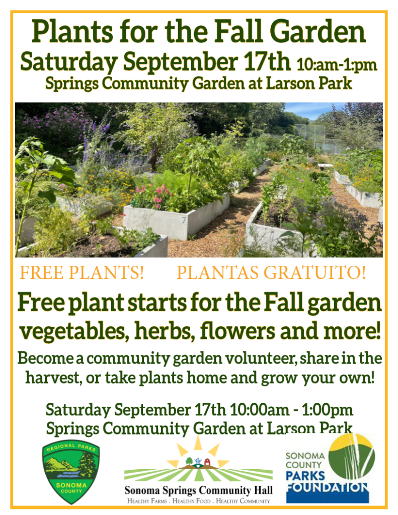 Sonoma Springs Commons is a Sonoma Valley 501(c)3 nonprofit with a mission to support the development, preservation and extension of that which we hold commons – public spaces such as the Springs Community Garden at Larson park Sonoma Springs Commons(SSC) grew out of the Sonoma Valley Grange and Sonoma Springs Community Hall organizations. as well as a continuation of the mission of the Sonoma Springs Community Hall organization.
