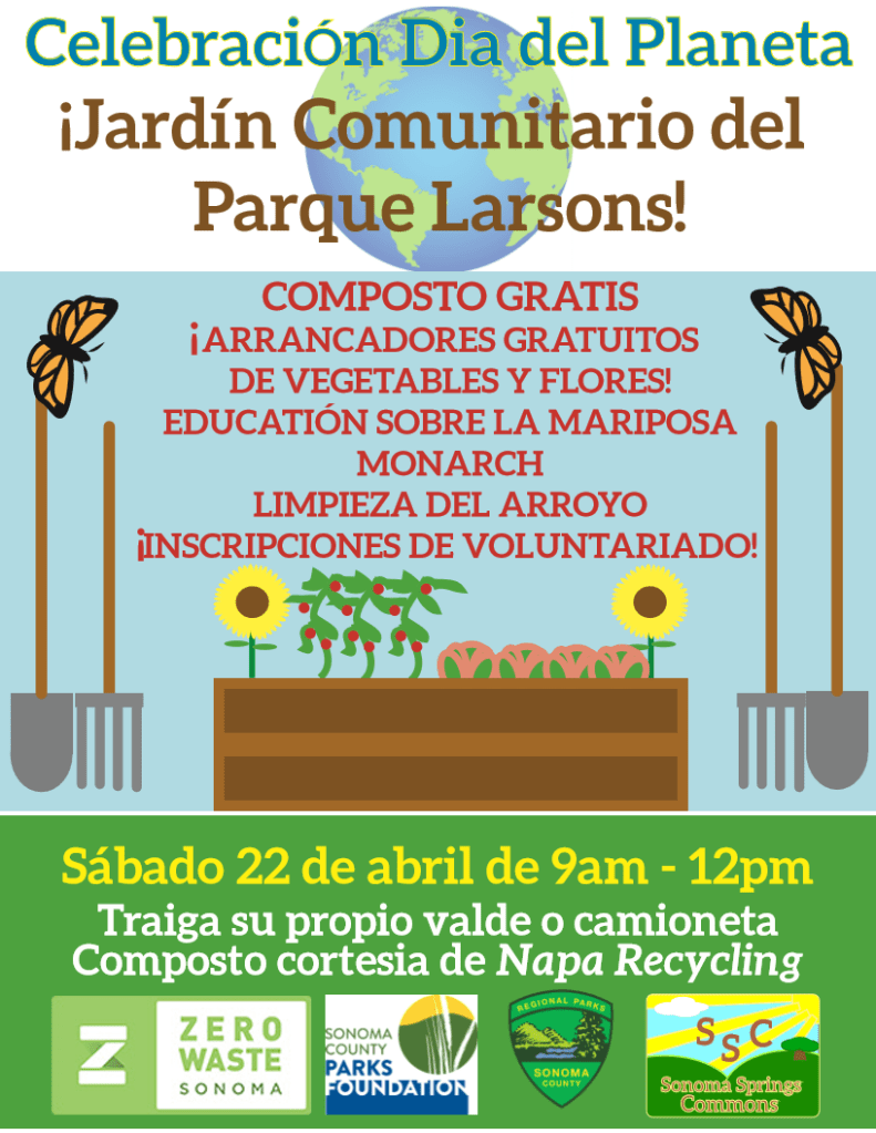 Thank You! To everyone who came out to Earth Day 2023 at Larson Park! Regional Parks cleaned up Sonoma Creek, representatives from our local Sheriff Department were on hand, Cindy Lindh and Monarch butterfly education, and the Springs Community Garden giving out thousands of plant starts and 20 yards of compost – a GREAT COMMUNITY DAY!