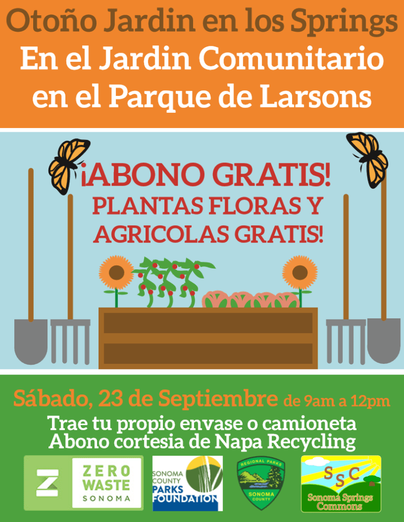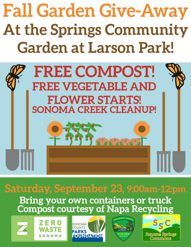We are back with free compost and plant starts, Saturday September 23rd, 900am – 12:00noon at the Springs Community Garden at Larson Park. Bring a bag, bucket, or truck for the free high quality composts courtesy of Zero Waste Sonoma County and Napa Recycling. And come early for free vegetable, herb, flower and perennial plant starts for your home garden!