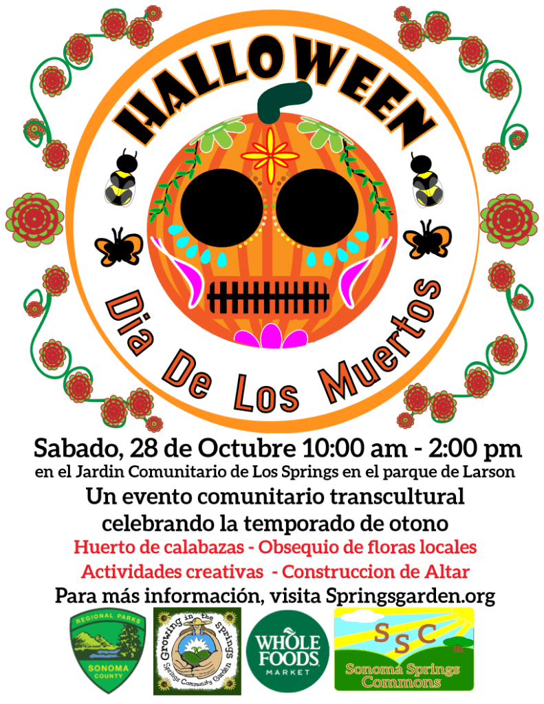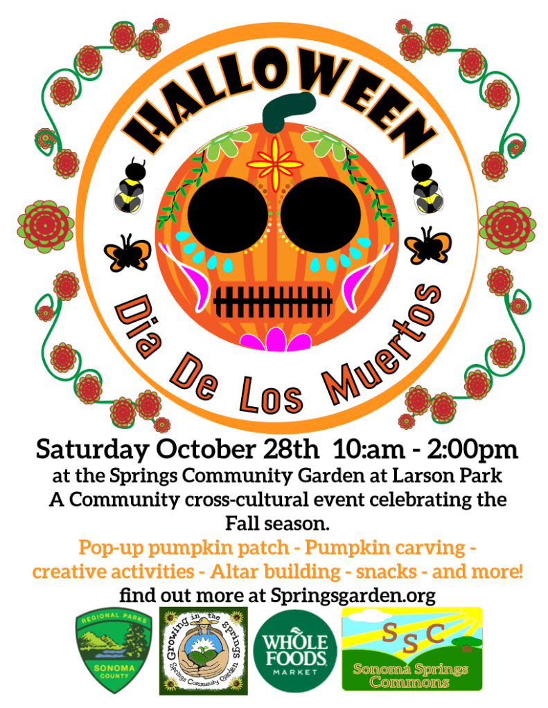Coming up! Saturday, October 28th, 10:00am-200pm, a spooky good time at the community garden, Free pumpkins, pumpkin carving and decoration, Dia de los Muertos Altar building, snacks and holiday treats!